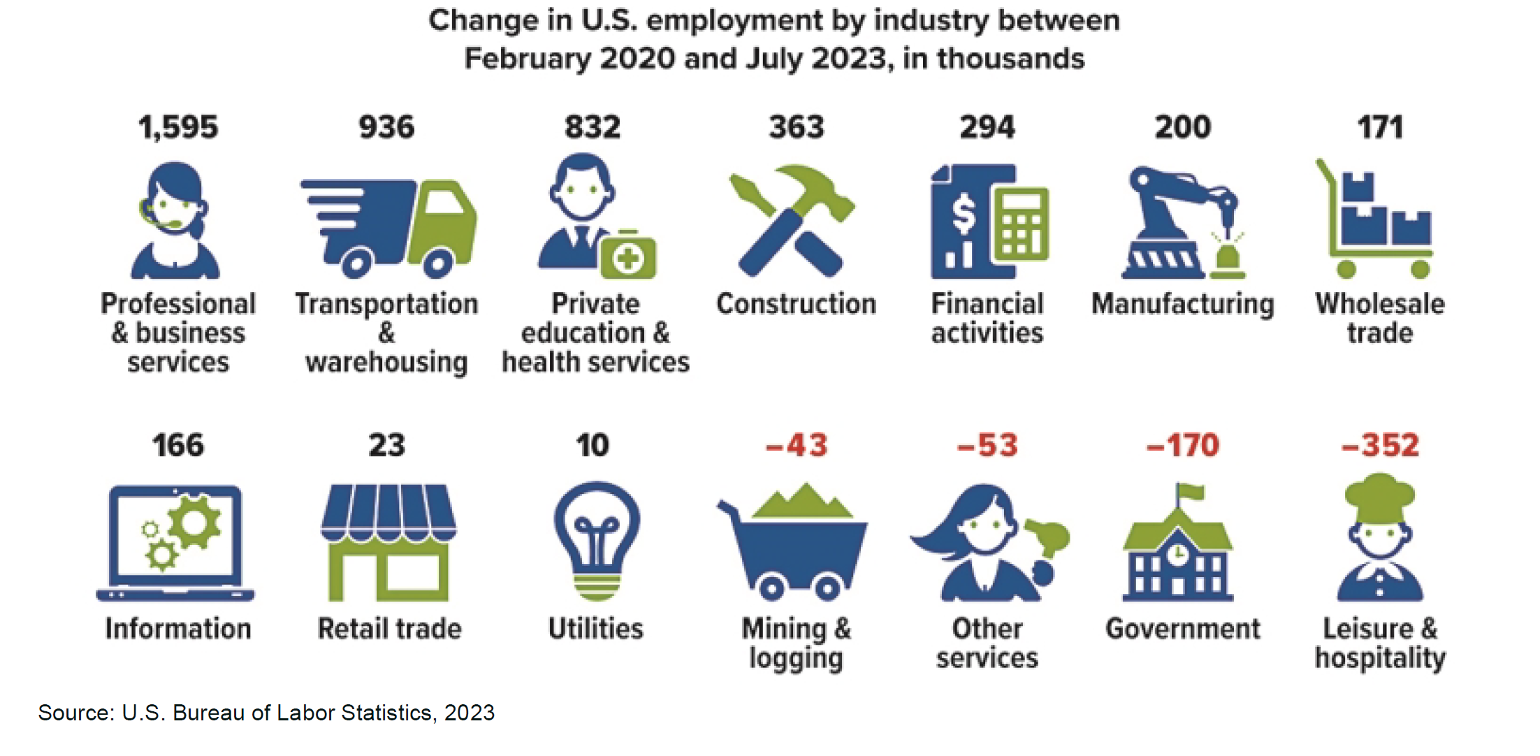 The U.S. economy lost nearly 22 million jobs during the two-month pandemic recession of March–April 2020. The total job count returned to pre-pandemic levels in June 2022, and by July 2023, there were almost 4 million more Americans working than before the pandemic. But jobs shifted among industries. The biggest gains have been in professional & business services (which includes many remote workers) and transportation & warehousing, while the biggest losses have been in leisure & hospitality and government, largely in public education.
