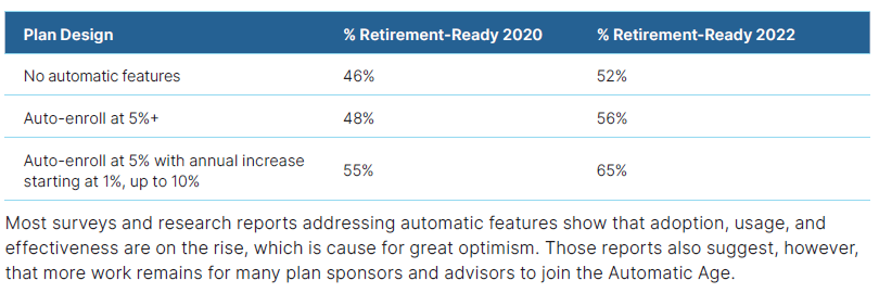 Just how many plans haven’t embraced the Automatic Age? According to the Society for Human Resource Management’s 2022 Employee Benefits Survey3 (based on responses from 3,129 human resource professionals across the U.S.), only about one-half of plans automatically enroll new or existing employees, and only 26 percent automatically increase employee contributions annually. Vanguard’s How America Saves 2022 report4 reveals that 56 percent of Vanguard plans have adopted automatic enrollment and two-thirds of those plans have implemented automatic annual deferral rate increases. The Plan Sponsor Council of America’s most recent annual survey puts those figures at 59 percent (auto-enroll) and 78 percent (auto-increase).